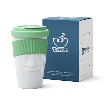 The Mug to Go with a TASTY face does not feature a handle, but it features a colorful sleeve for protecting the fingers from hot liquids. And as always, the mug itself is crafted from premium hard porcelain.