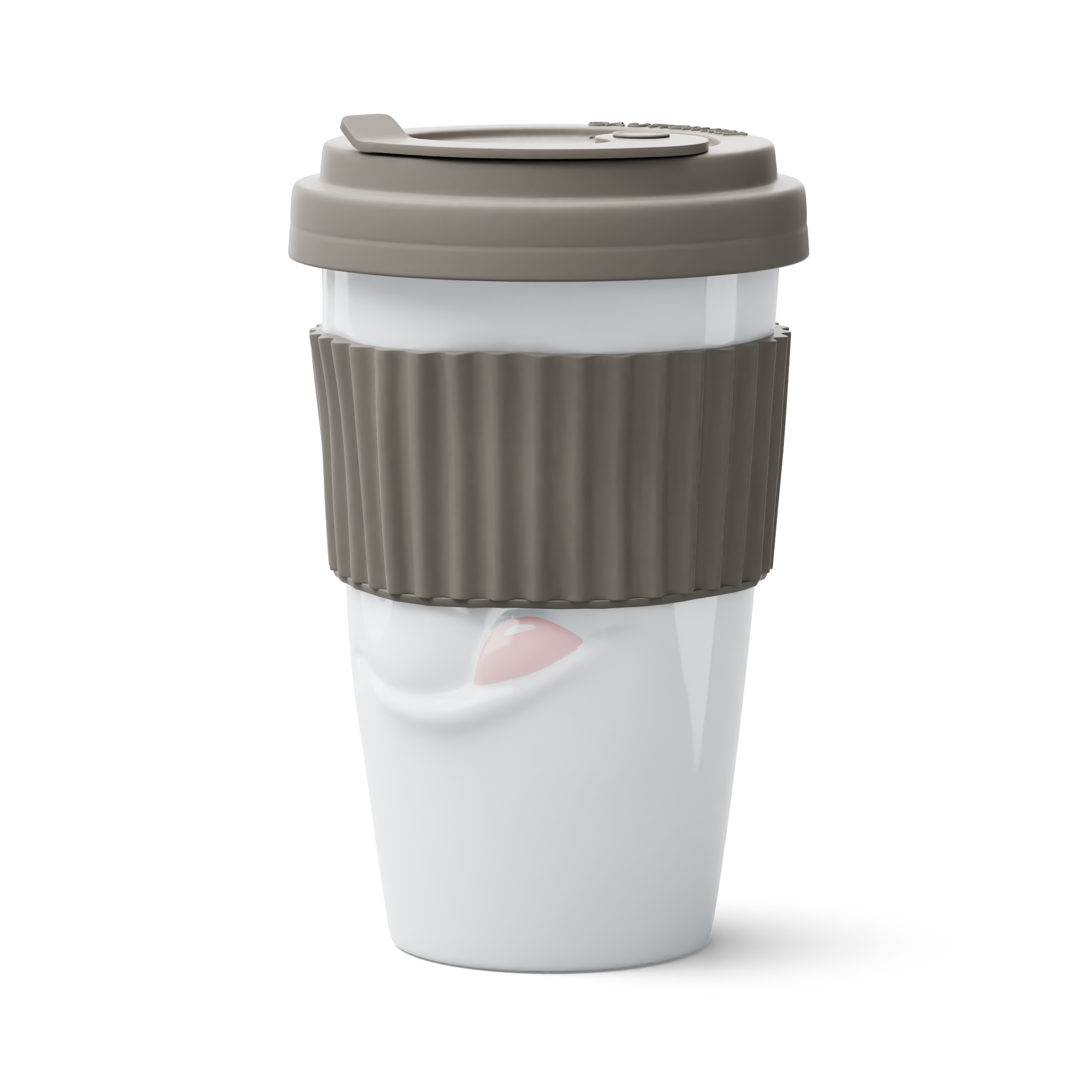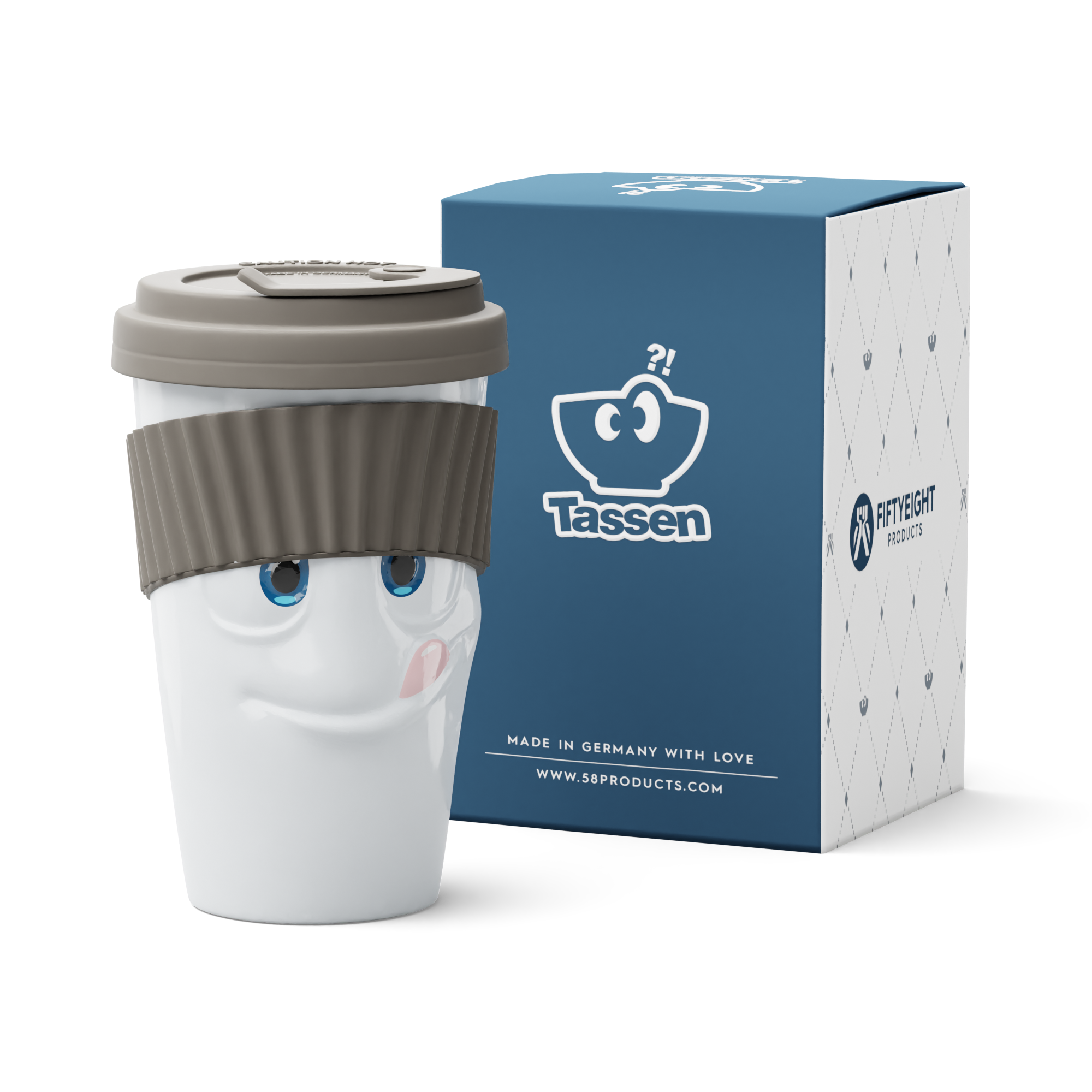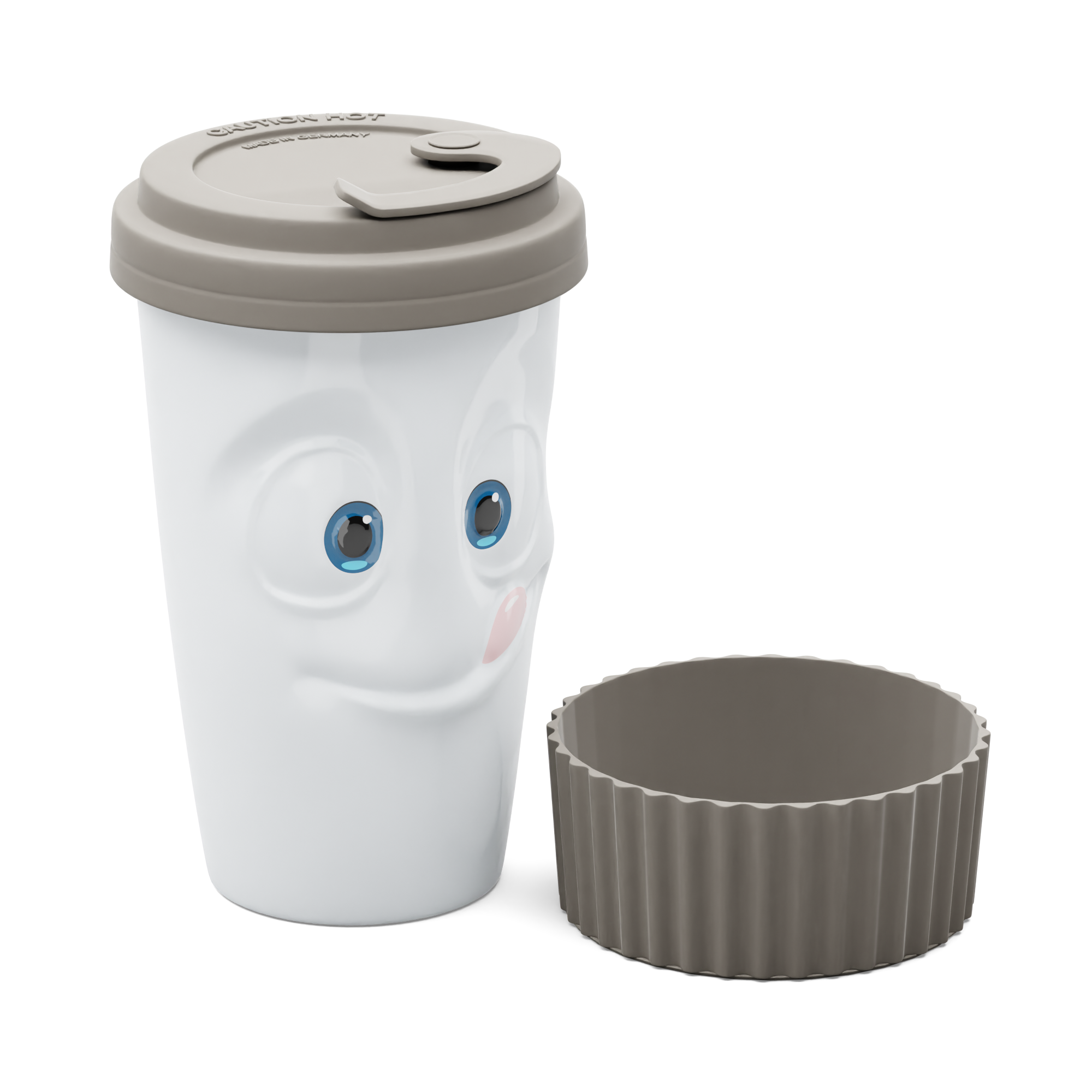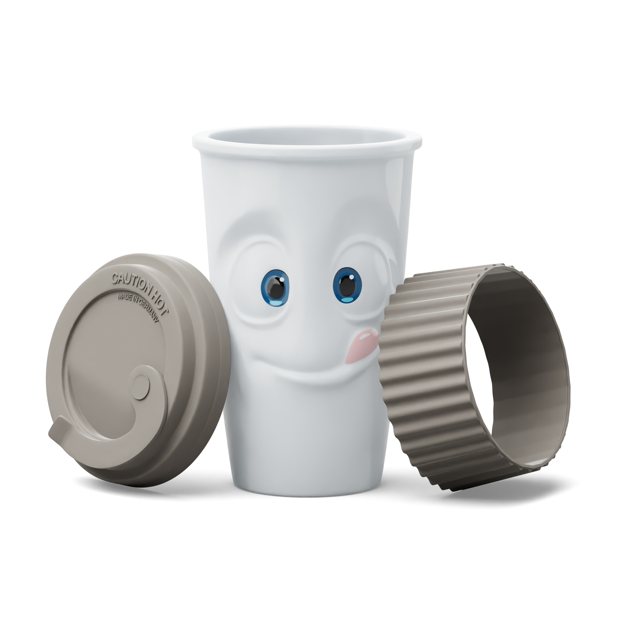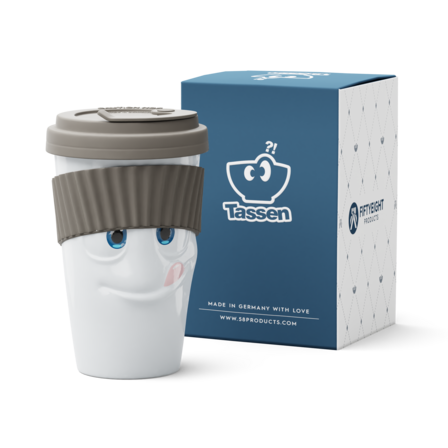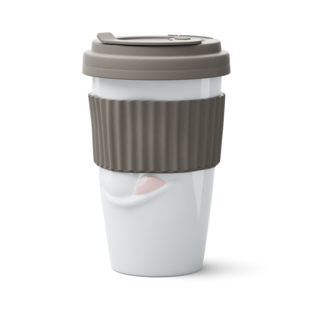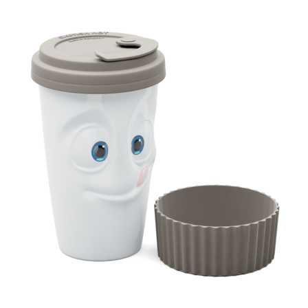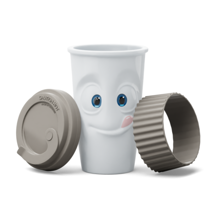 The Mug to Go with a TASTY face does not feature a handle, but it features a colourful sleeve for protecting the fingers from hot liquids. And as always, the mug itself is crafted from premium hard porcelain.