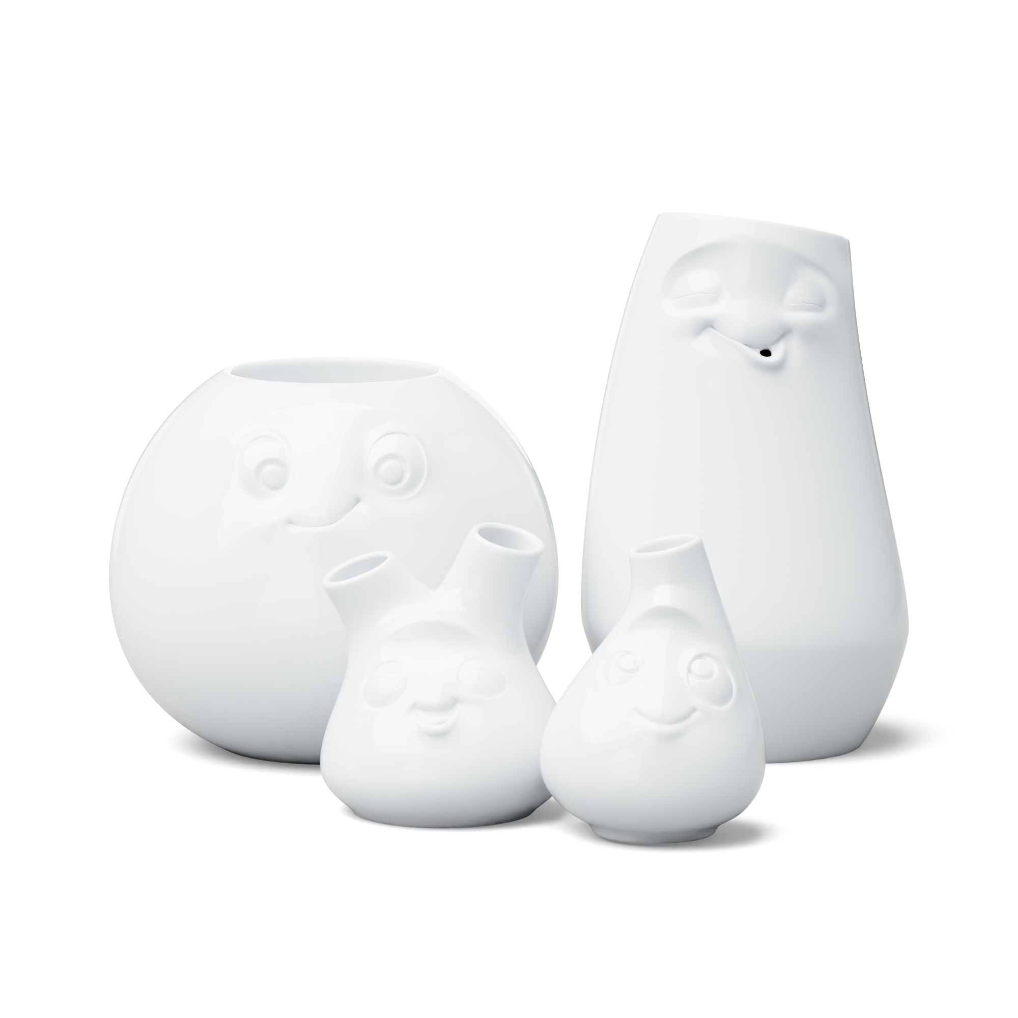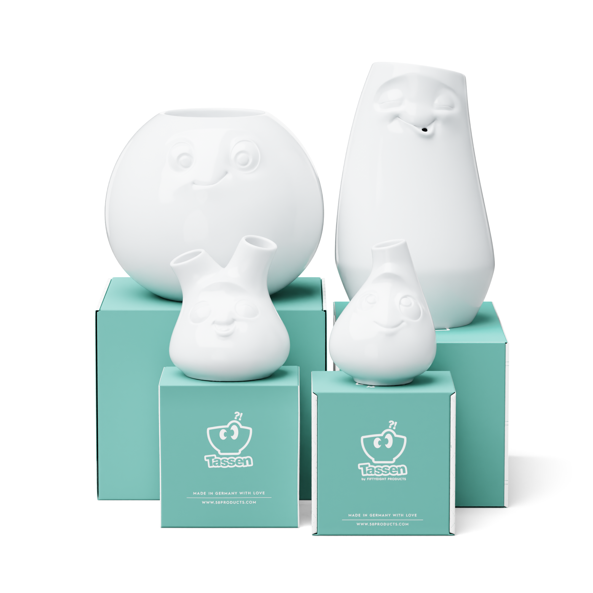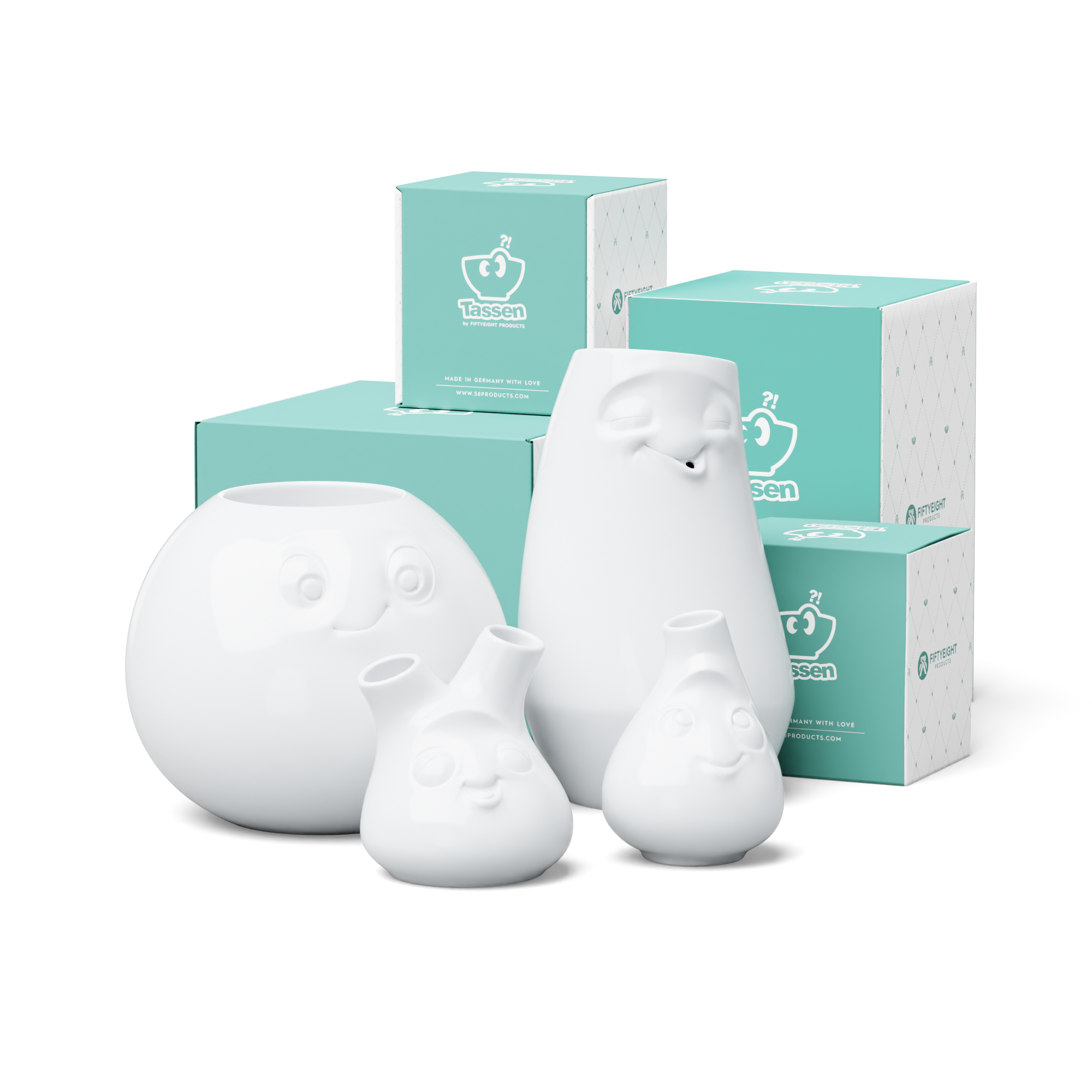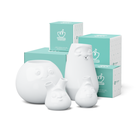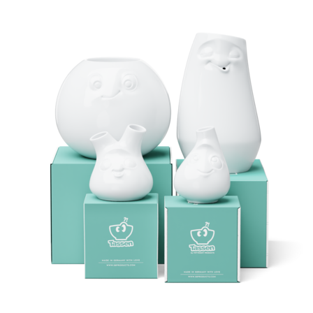 Our discounted Special Set FLOWER POWER contains all of our 4 Vases LAID-BACK, AMUSED, CHEEKY and CUTE + 5 Postcards.