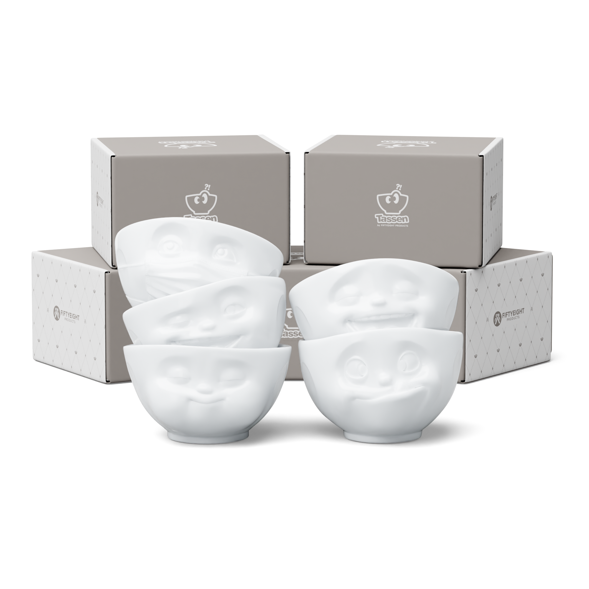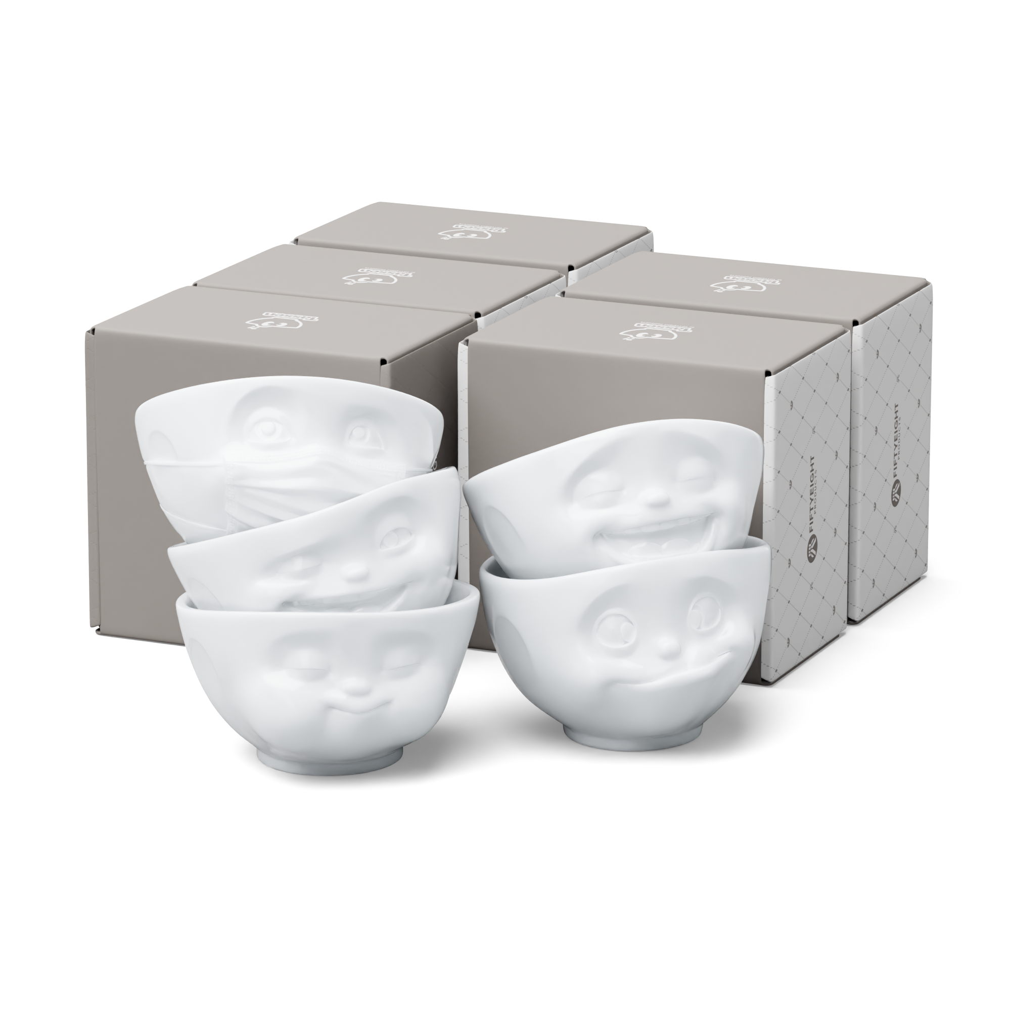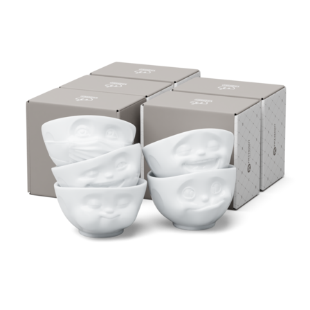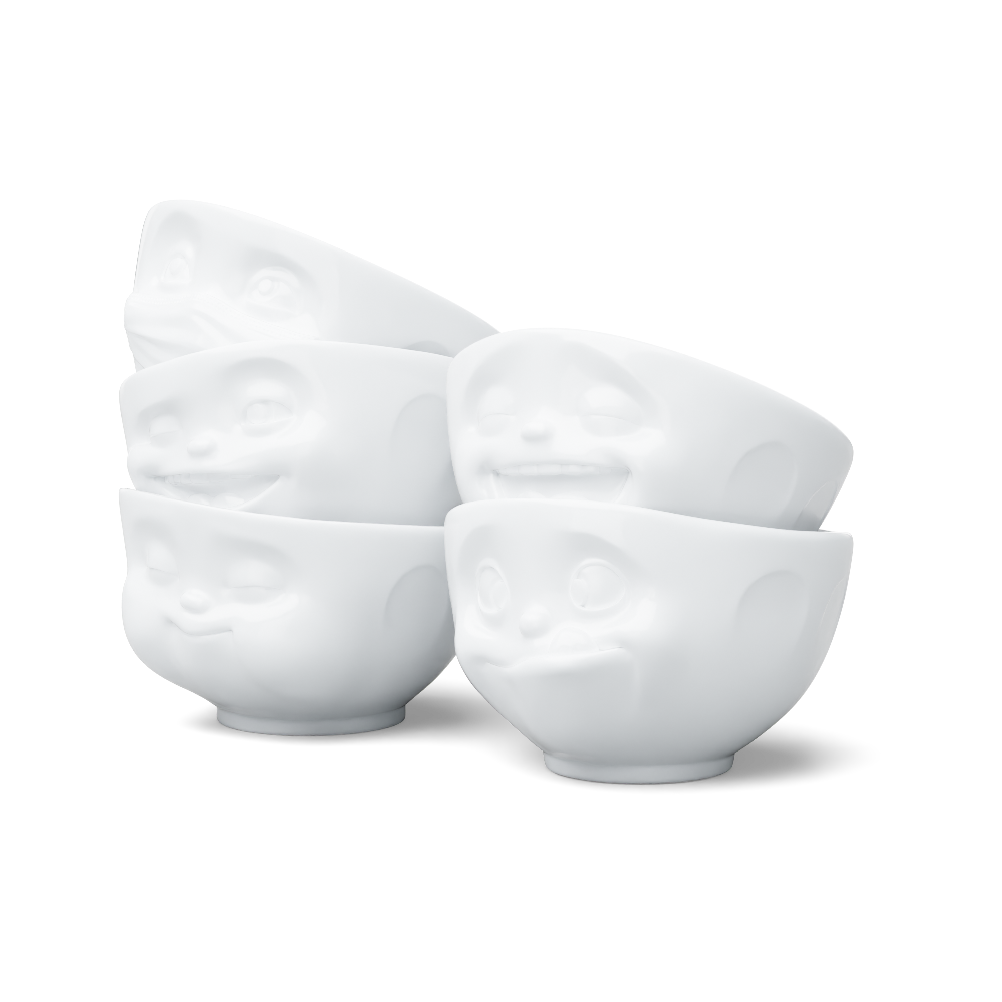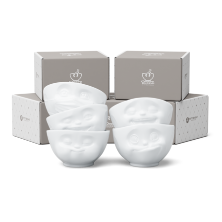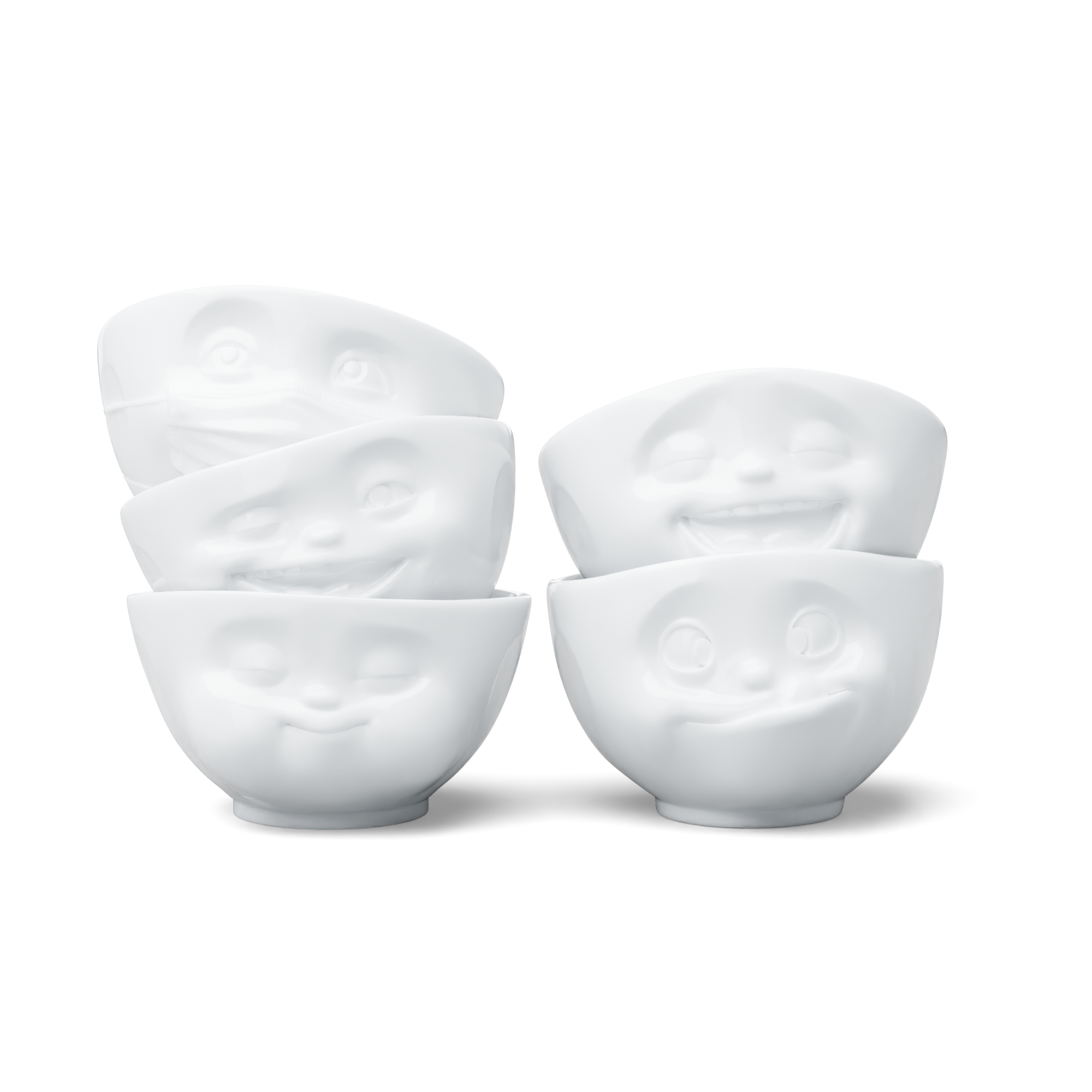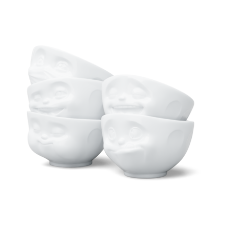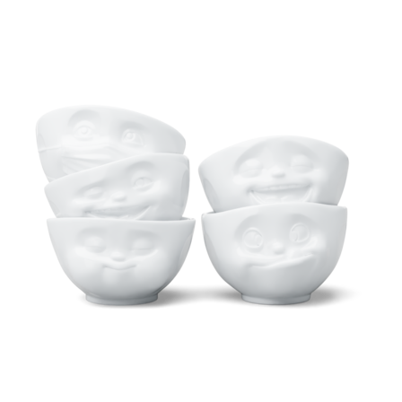 Our discounted 500 ml bowl set no. 2 contains our bowls TASTY, LAUGHING, HOPEFUL, WINKING and MUNCHING + 5 postcards*