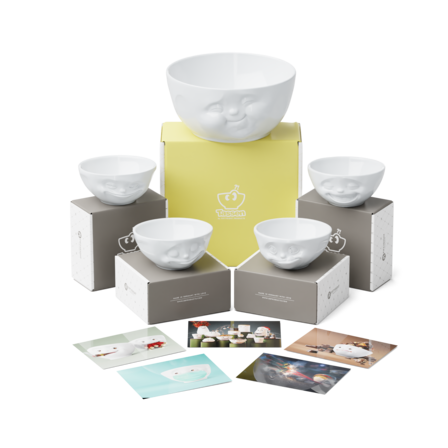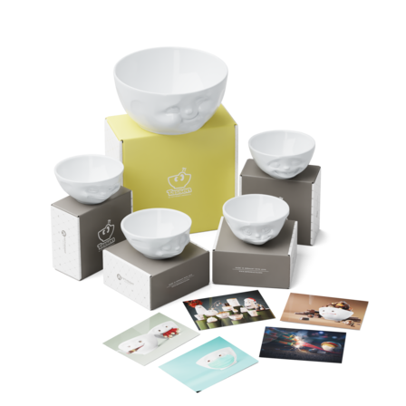 Our Munching Combo contains the big Bowl MUNCHING, all of our 4 350 ml bowls GRINNING, HAPPY, TASTY and LAUGHING + 5 Postcards*