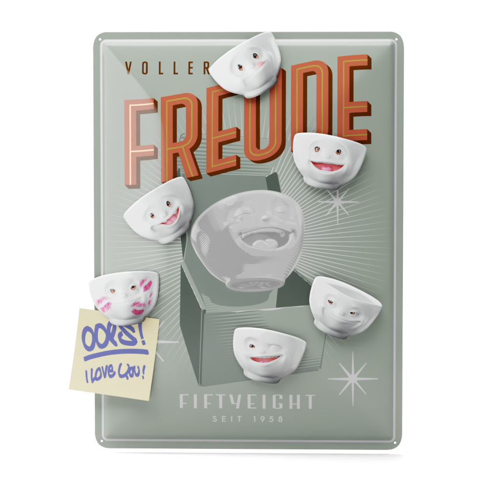 Turn our tin-plate sign FULL OF JOY into the perfect pin board – now as a set with 6 unique magnets + 5 postcards!