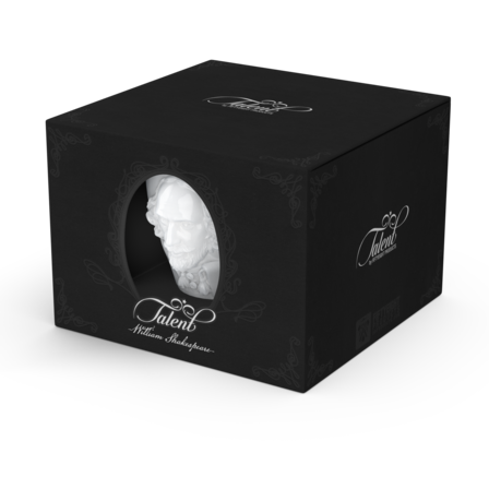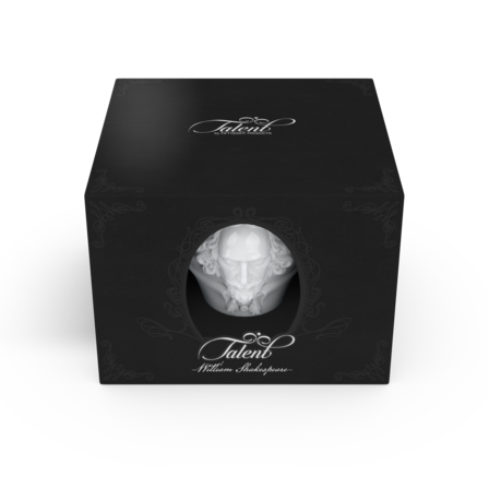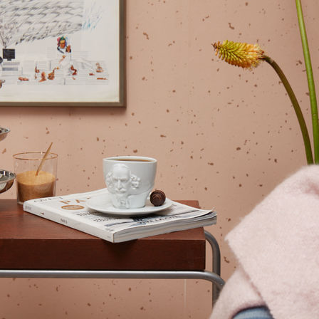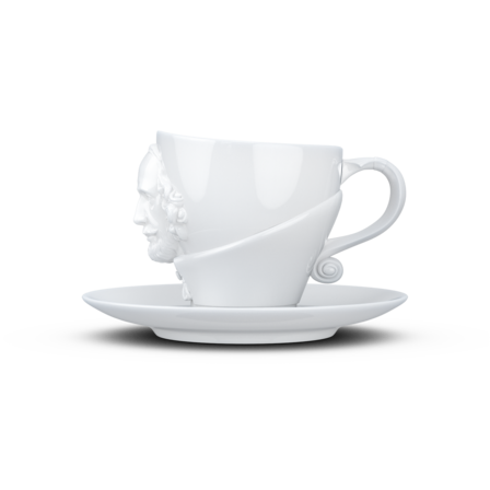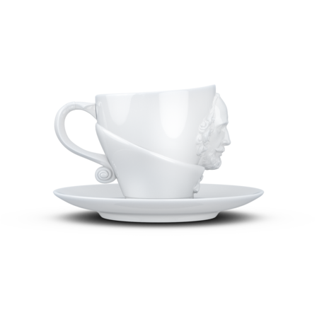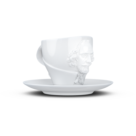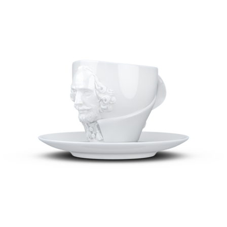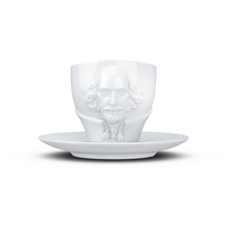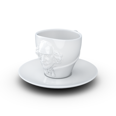 Crafted from hard porcelain, our exclusive Shakespeare coffee cup with a handle and saucer features the 3D-sculpted, hyper-contoured rendering of the artists’ facial expression.