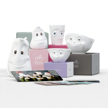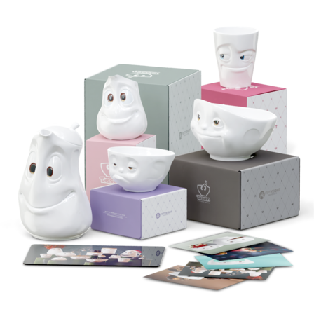 Our Pot GOOD MOOD, the little jug JOLLY, the bowl DREAMY (500 ml), the medium bowl SNOOZY (200 ml), the Mug with handle IMPISH, the breakfast borad CHRISTMASWARE and 5 postcards*.
