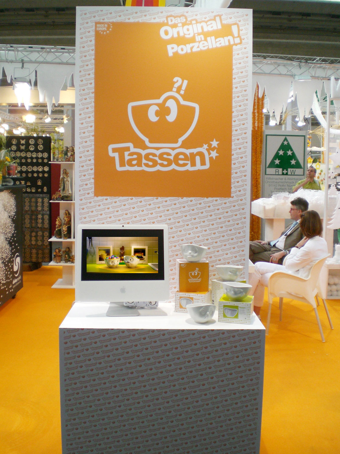 Our very first products were the "sulking" and "grinning" TASSEN bowls. The two animated little tea cup characters had become quite famous through a first viral video with audio dubbed by members German comedy team Mundtstuhl. We were inspired to produce a number of follow-up clips, which we screened on an iMac at the center of our product display.